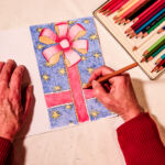 Giving someone a card of greeting reminds them that they are valued and appreciated. It affirms and strengthens your community and the more personal the card, the better. This card gets you started in a very personal expression as you print, color, cut, and fold it. Inside you can write your message. It can be for just one, a few, or scan your colored version and print many. The card could also be another activity at your Holiday party. You print it as many times as you like, color it (the version shown here was colored with pencils), and fold it. Grandparents will be thrilled to receive one-of-a-kind cards from grand kids.